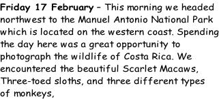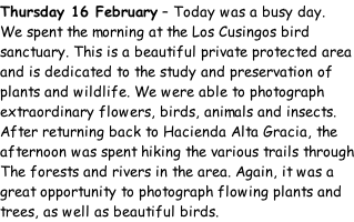 Wednesday 15 February – Today we head to Costa Rica’s Central Valley where we will spend two days at the Hacienda Alta Gracia resort. On the way thee, we stopped and spent some time in the Los Quetzales National Park. Here we walked